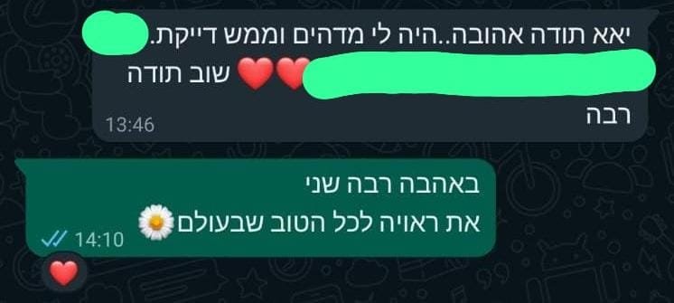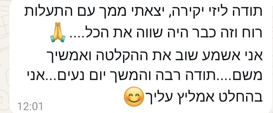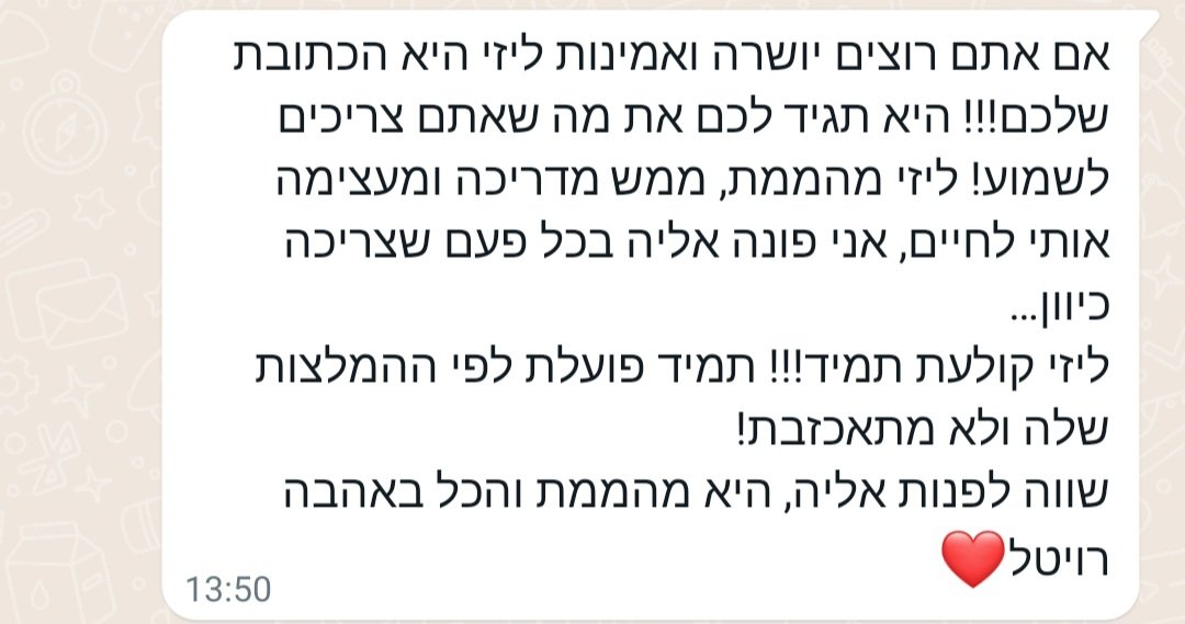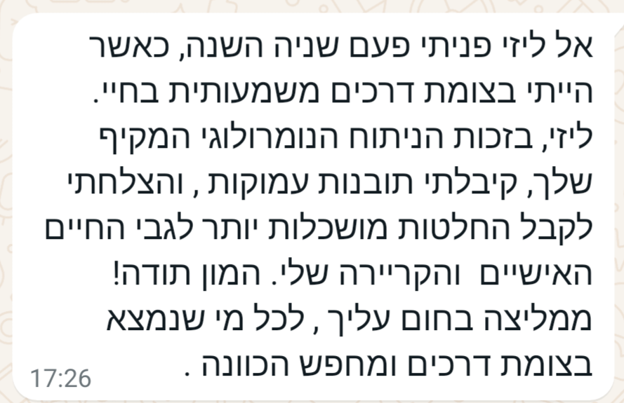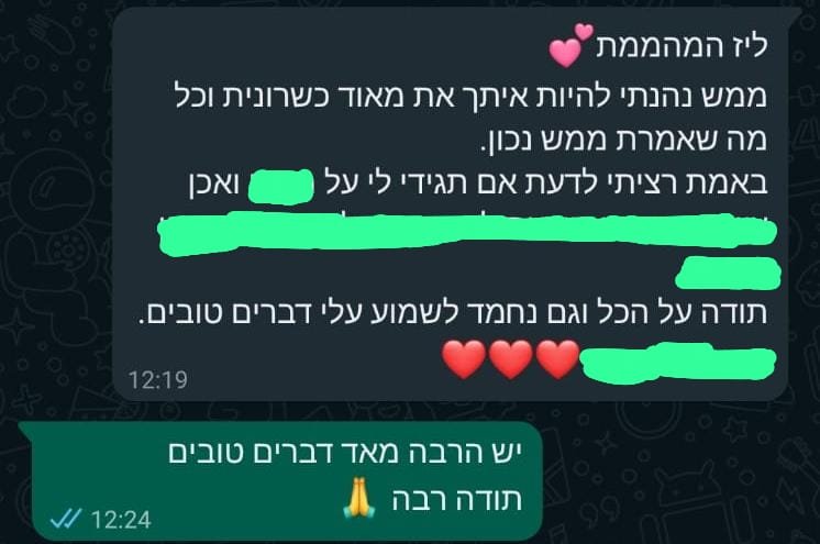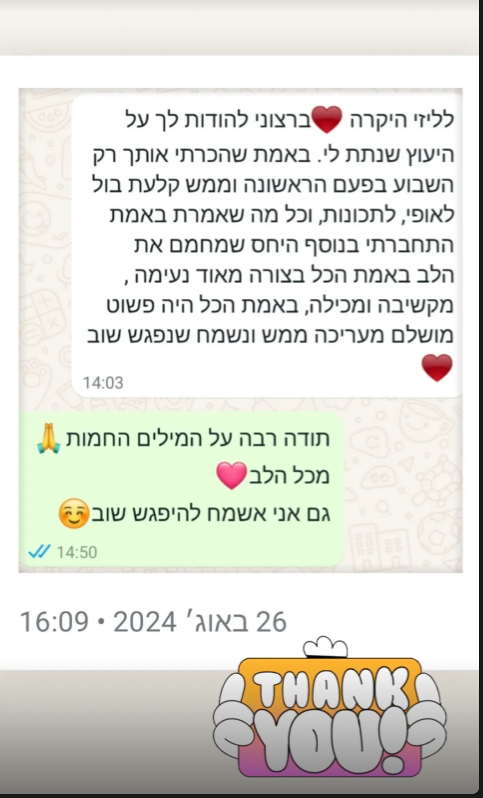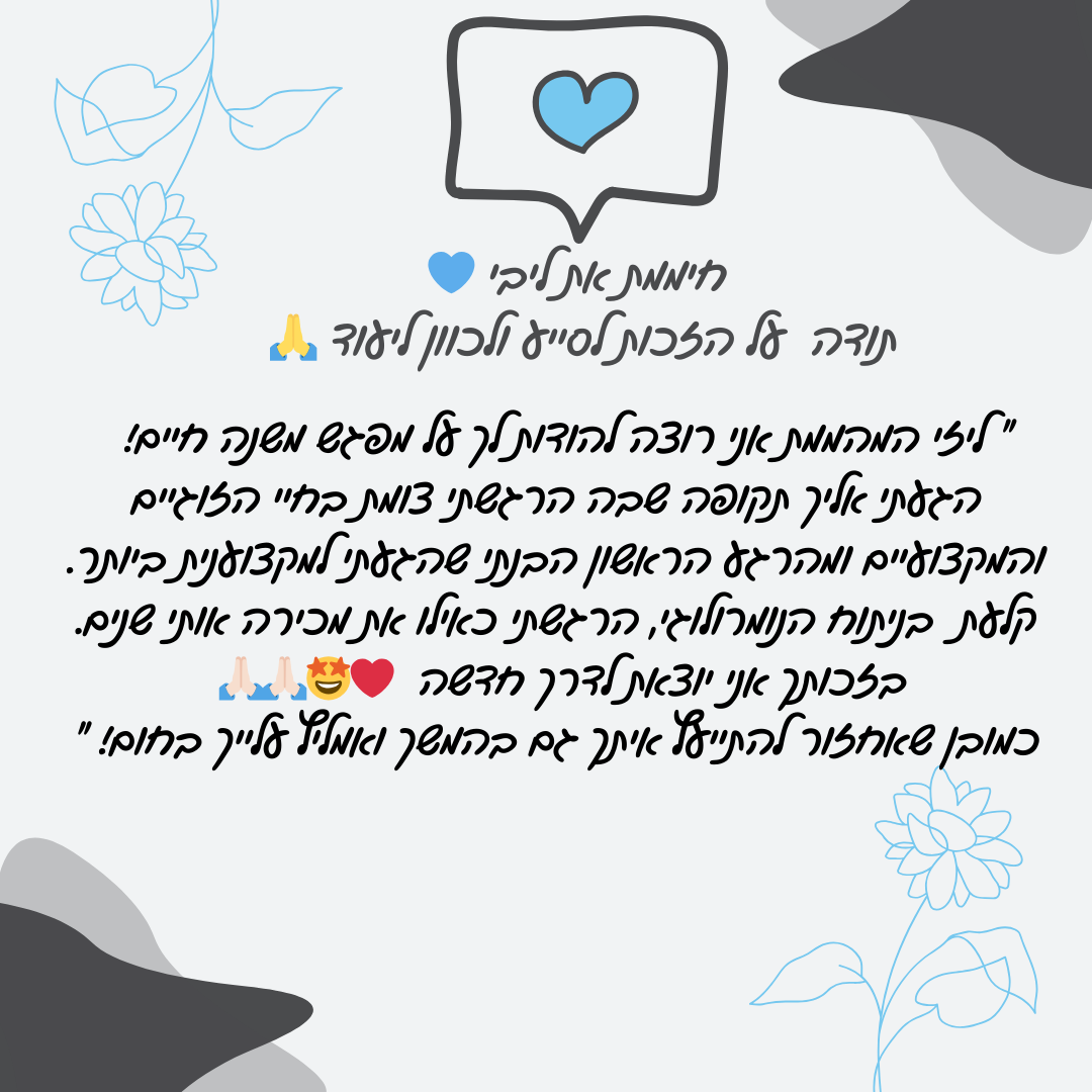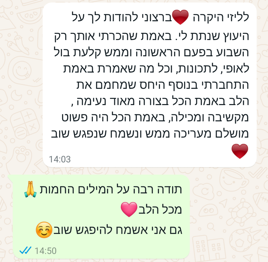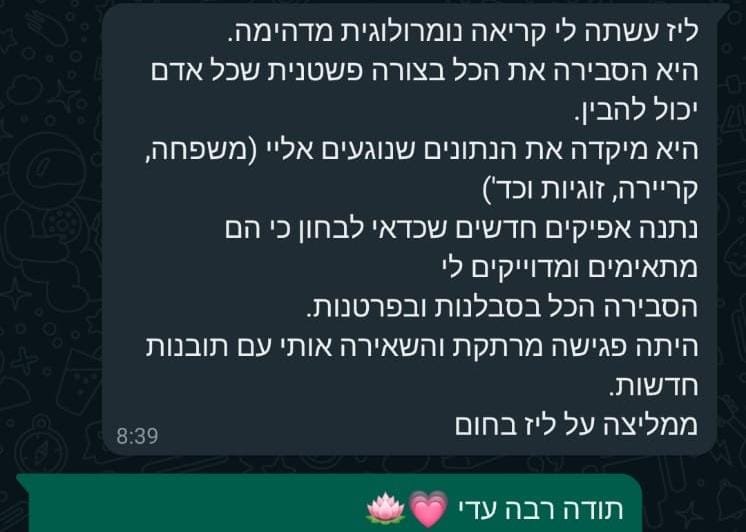 בשעה אחת שתקדישו לעצמכם, תקבלו מפת דרכים ברורה, תובנות וכלים להחלטות חשובות ולהתמודדות בנושאים שונים. בתום הפגישה תצאו מחוזקים, עם תחושת בהירות וביטחון, שיסייעו לכם לבנות לעצמכם חיים רגועים יותר, רוויי סיפוק ומשמעות כפי שאני בניתי לעצמי – עם אותם הכלים והתובנות שאני מעבירה לכם באהבה.