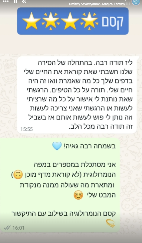 הגעתי לנומרולוגיה מתוך סקרנות ואחרי חיפוש ארוך ומתסכל אחר העיסוק בו ארגיש שאני מביאה את עצמי לידי ביטוי. במהלך אותו חיפוש עצמי והתמודדויות לא מעטות עם אתגרים שהחיים זימנו לי, נעזרתי בידע וכלים שרכשתי בתחומים מגוונים- קבלה, פסיכולוגיה, אימון מנטלי ועוד- בזכותם, בנחישות ובהתמדה, הצלחתי לשנות את חיי לחלוטין.